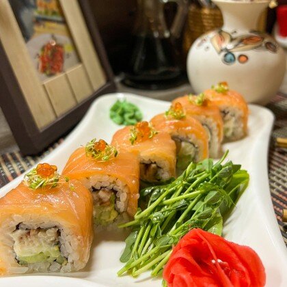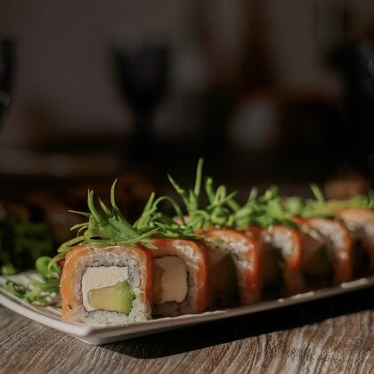 Ямакаси с опаленным лососем, творожным сыром, грибами шиитаке и хияши вакаме