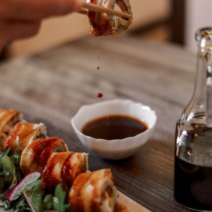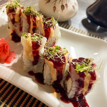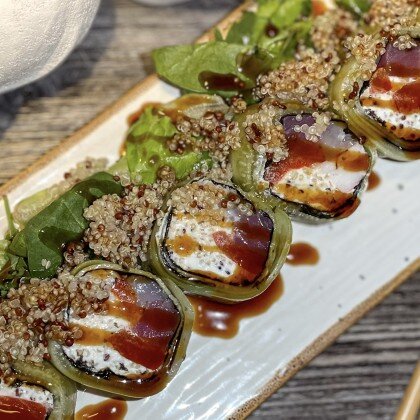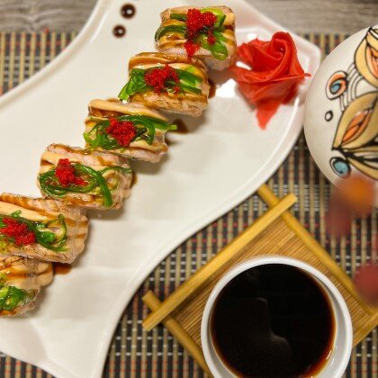 Ролл с киноа, тунцом, тигровыми креветками и обожжённым перцем