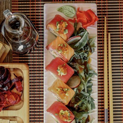 Якудза с лососем, тунцом, творожным сыром, авокадо и хрустящим катаифи