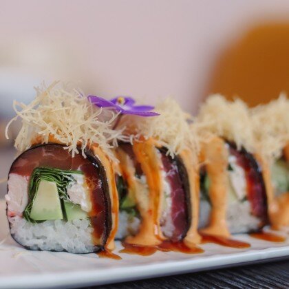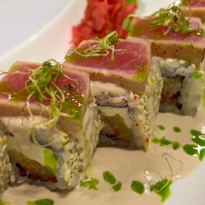 Татаки ролл с тунцом, творожным сыром, манго и икрой тобико
