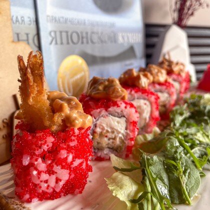 Темпура с креветками, тунцом, творожным сыром и икрой тобико