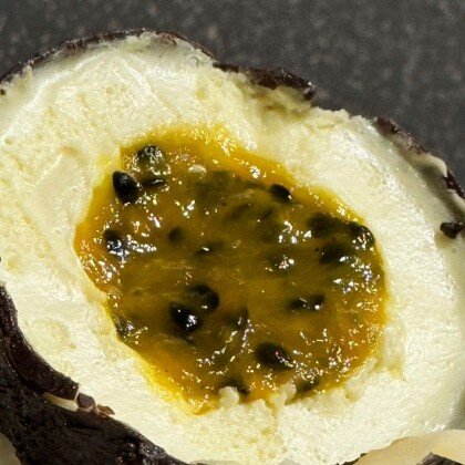 Десерт в виде кокоса со взбитым кокосовым ганашем, жидкой начинкой из маракуйи и корпусом из двух видов шоколада
