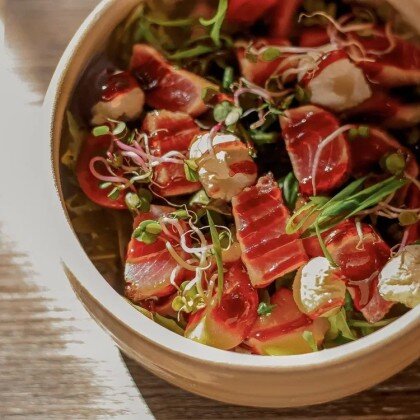 Салат с тунцом, манго, творожным сыром и устричным соусом