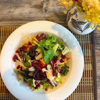 Салат с курицей в азиатском стиле с вишнёвым соусом и грибами муэр