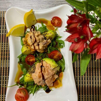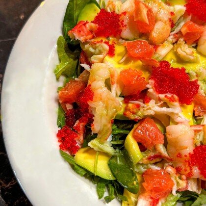 Салат с камчатским крабом, тигровыми креветками, авокадо и соусом вассабико