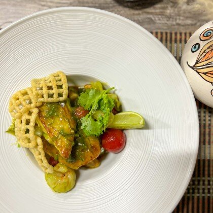 Окунь с тигровыми креветками и хрустящими снэками