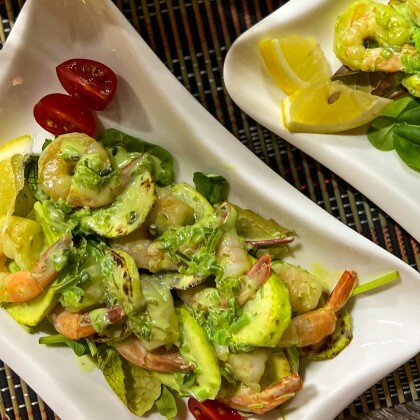 Креветки с цукини, помидорами черри под соусом из морских водорослей