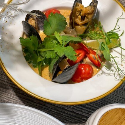 Морепродукты в кокосовом молоке с грибами и помидорами черри