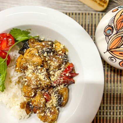Курица в соусе терияки с рисом, болгарским перцем, грибами и орехами кешью