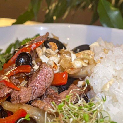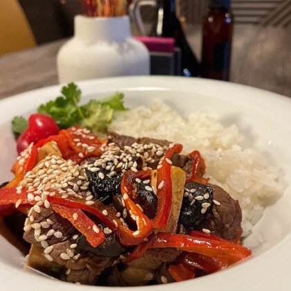 Говядина с грибами шиитаке, сыром тофу и рисом